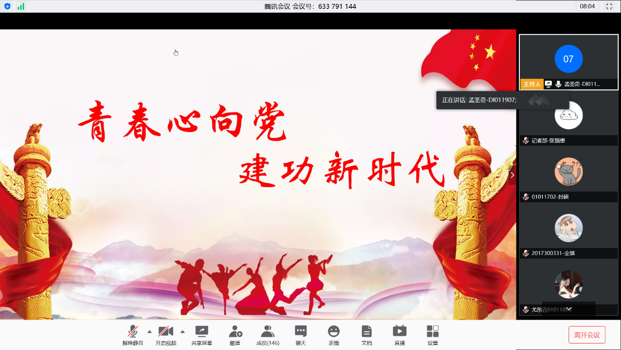 为响应校团委关于进一步开展“青春心向党,建功新时代”主题宣传教育实践活动的号召,弘扬抗疫精神与家国情怀,4月28日19:00,伟德国际1949源于英国通过腾讯会议线上举行了青年榜样宣讲活动,主持人孟圣奇、各宣讲发言人以及伟德国际1949源于英国的同学们参与了本次活动。
