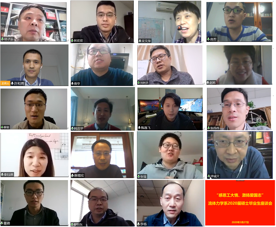 2020年3月27日上午9:30,流体力学系举行了2020届硕士毕业生“感恩工大情、激扬爱国志”网络座谈会。本次座谈会采用腾讯会议的方式进行网络视频和音频交流,流体系全体毕业研究生和指导教师代表共50余人参加了会议(除了部分因课冲突请假的师生)。