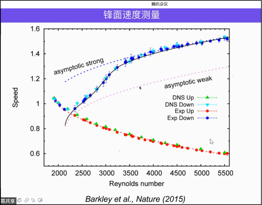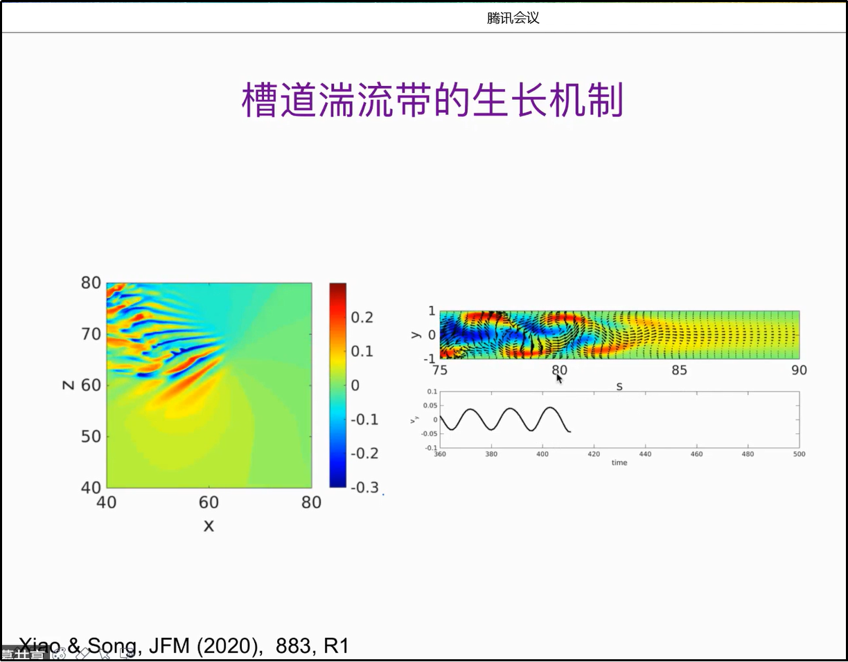 宋保方副教授主要通过两个专题的分享,向大家介绍近年来层流向湍流转捩领域中的若干研究进展。在“管流稳定性、转捩和临界现象”专题中,首先,向各位同学普及了湍斑的概念;接着,围绕湍斑的发生机理、可自持(sustained)湍流发生的临界雷诺数、湍斑到扩展湍流态的转捩、完全湍流的出现等方面,详细介绍了湍斑表现出来的瞬态特性、混沌特性以及分裂特性;最后,针对湍斑向扩展湍流态转变临界雷诺数的确定,向大家介绍了他本人近年来与他人合作提出的反应-扩散-对流简化模型,并解释了该模型可以作为湍斑向扩展湍流态转捩雷诺数的判断依据的原因。在“槽道流动中的转捩和临界现象”专题中,介绍了槽道湍流带的生长机制、槽道湍流带头部流动失稳机制以及湍流带倾斜方向的决定机制,分享了其研究团队在湍流带的瞬态性和平均寿命的长度依赖性研究方面的进展情况。