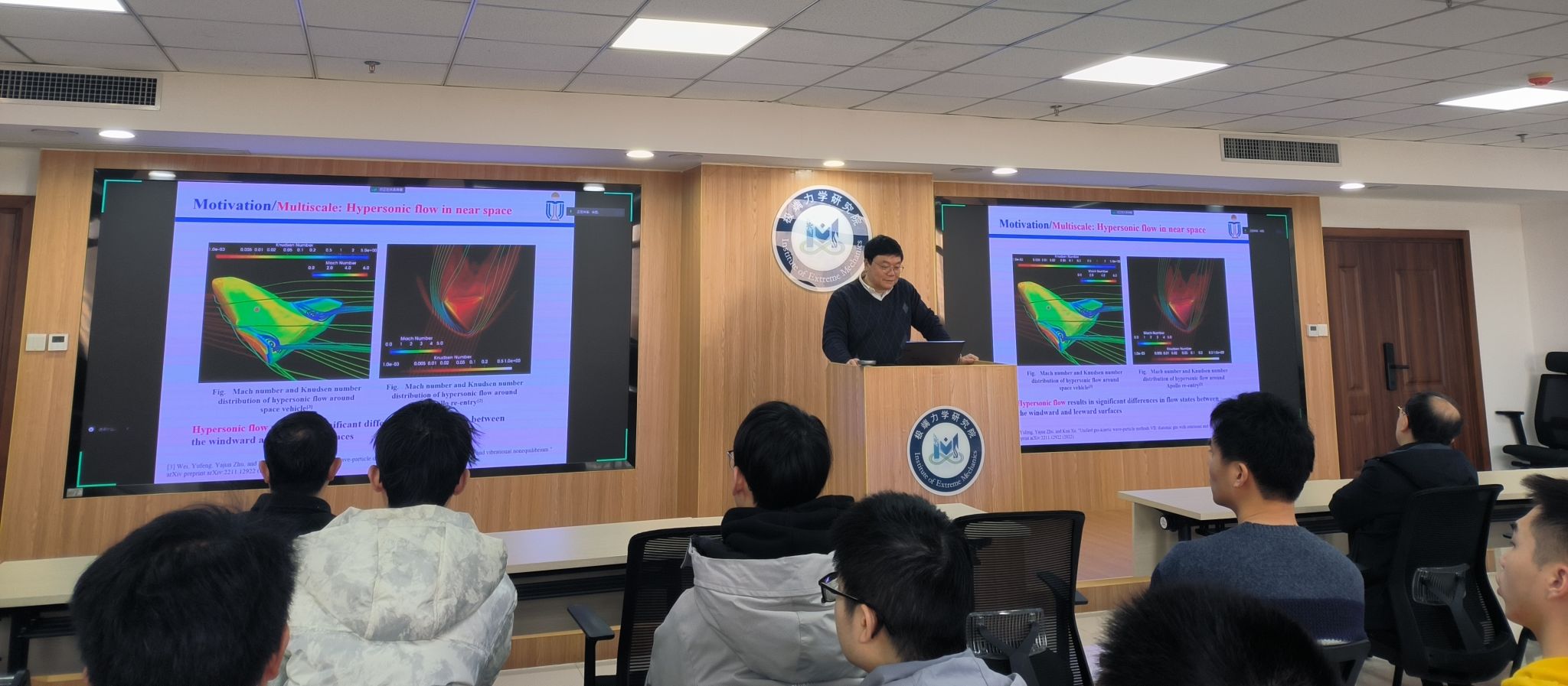 此外,徐昆教授还介绍了香港科技大学本科生、硕/博士生研究生招生政策。徐昆教授与线上线下的师生们进行了深入讨论,就多尺度建模和数值模拟、香港科技大学本科生项目的相关问题耐心逐一解答。此次报告会为我校师生及同行提供了多尺度输运过程直接建模的研究启发,加深了我校师生对气体动理学多尺度算法和高阶格式构造相关技术的了解。
