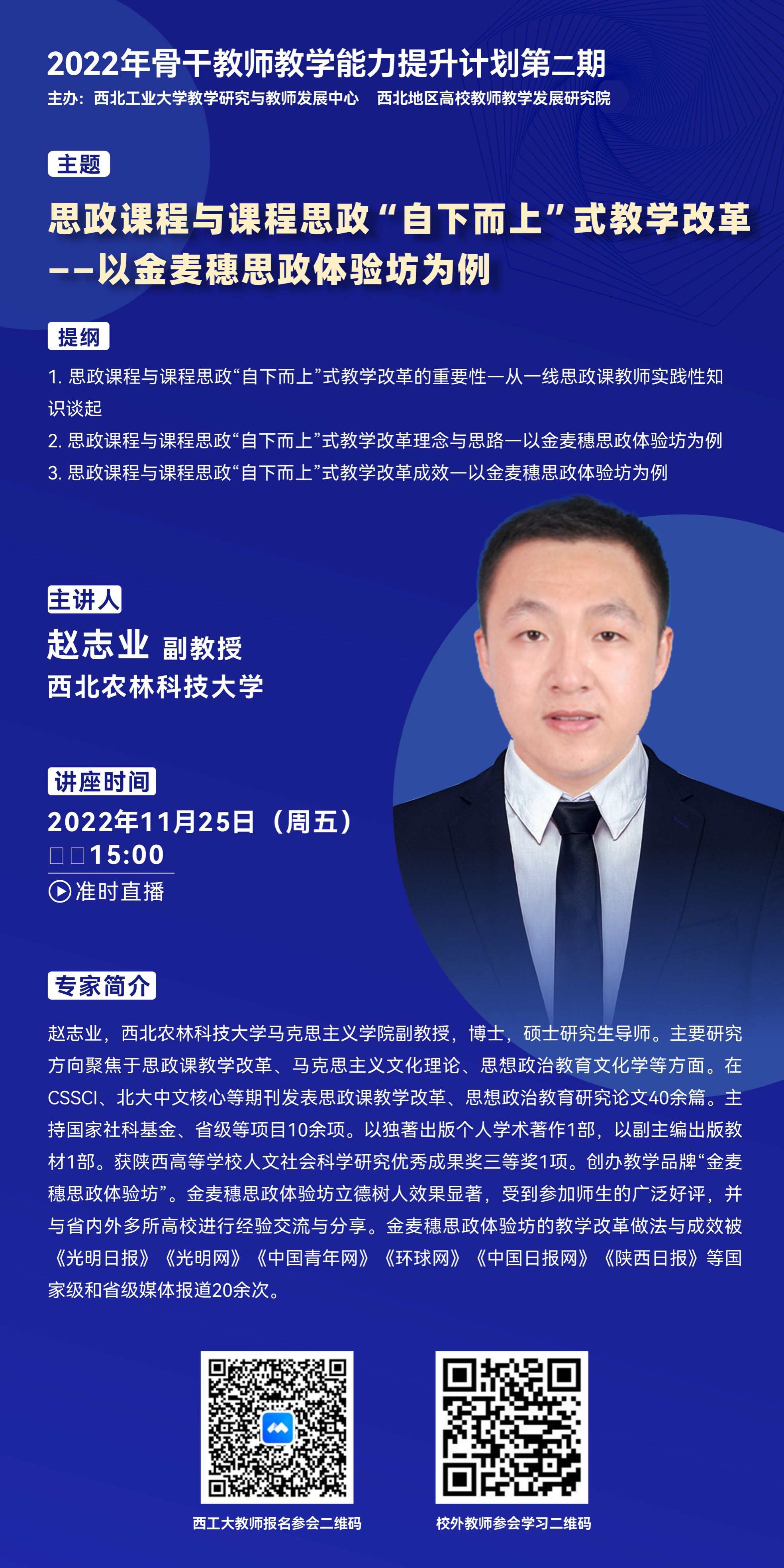 各位老师好!“2022年骨干教师教学能力提升计划”第二期分享活动定于11月25日(周五)下午15:00,邀请西北农林科技大学赵志业副教授围绕“思政课程与课程思政自下而上式教学改革案例”进行分享”,通过腾讯会议扫码报名即可参加在线学习。欢迎有意向的老师积极参加,谢谢!
