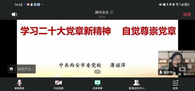 薄谊萍围绕《学习二十大党章新精神 自觉尊崇党章》主题,以政党的产生、党章的发展历程入手,从“四个需要”“”两个特征“”讲述了二十大党章修改的原因和特点,从十一个方面详细讲解了二十大党章修改的主要内容,从“十个准确把握”和“六个牢记”解读了如何学习遵守贯彻维护好二十大党章精神,多角度、全方位介绍了二十大党章中新理论、新观点、新内容的丰富内涵。