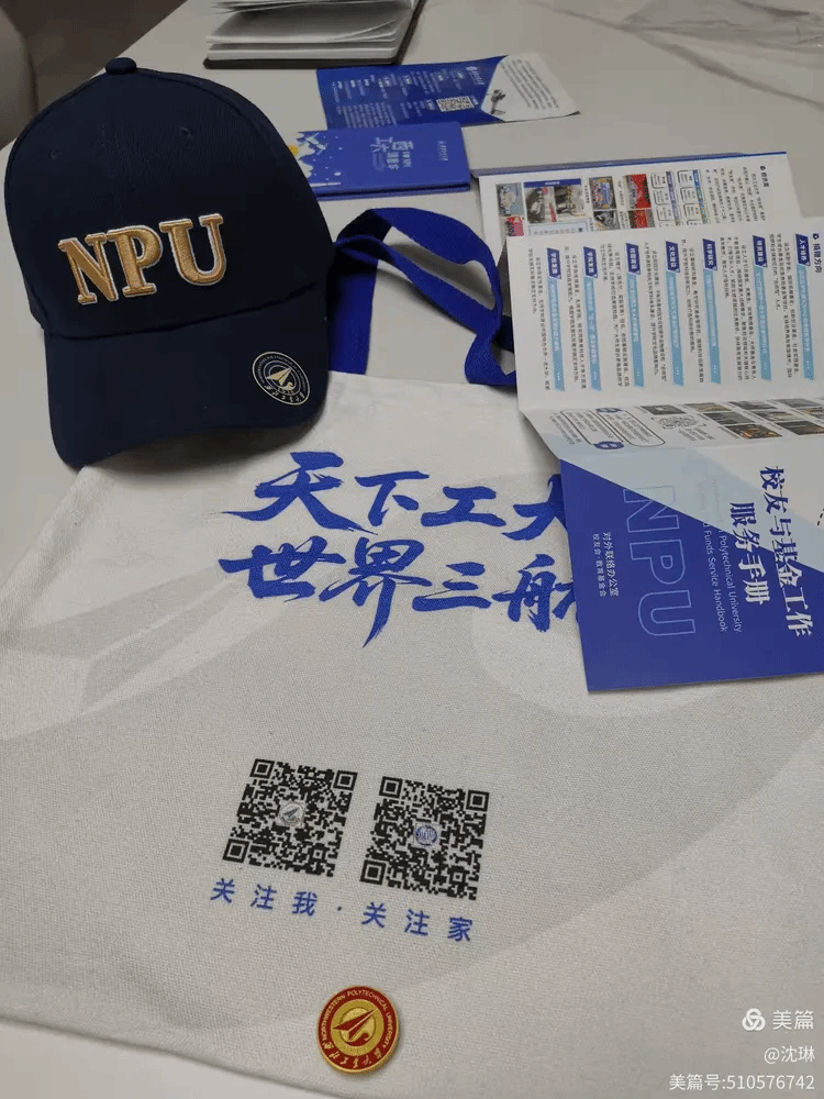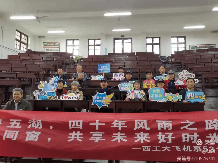 宴会大厅悬挂着红色横幅:“遍四海五湖,四十年风雨之路。聚母校同窗,共享未来好时光。西工大飞机系5311班”,同学们看着金色的校徽、蓝色的绣着“NPU”字样的棒球帽、“天下工大 世界三航”的帆布袋,诗意大发,用诗词抒发心意。