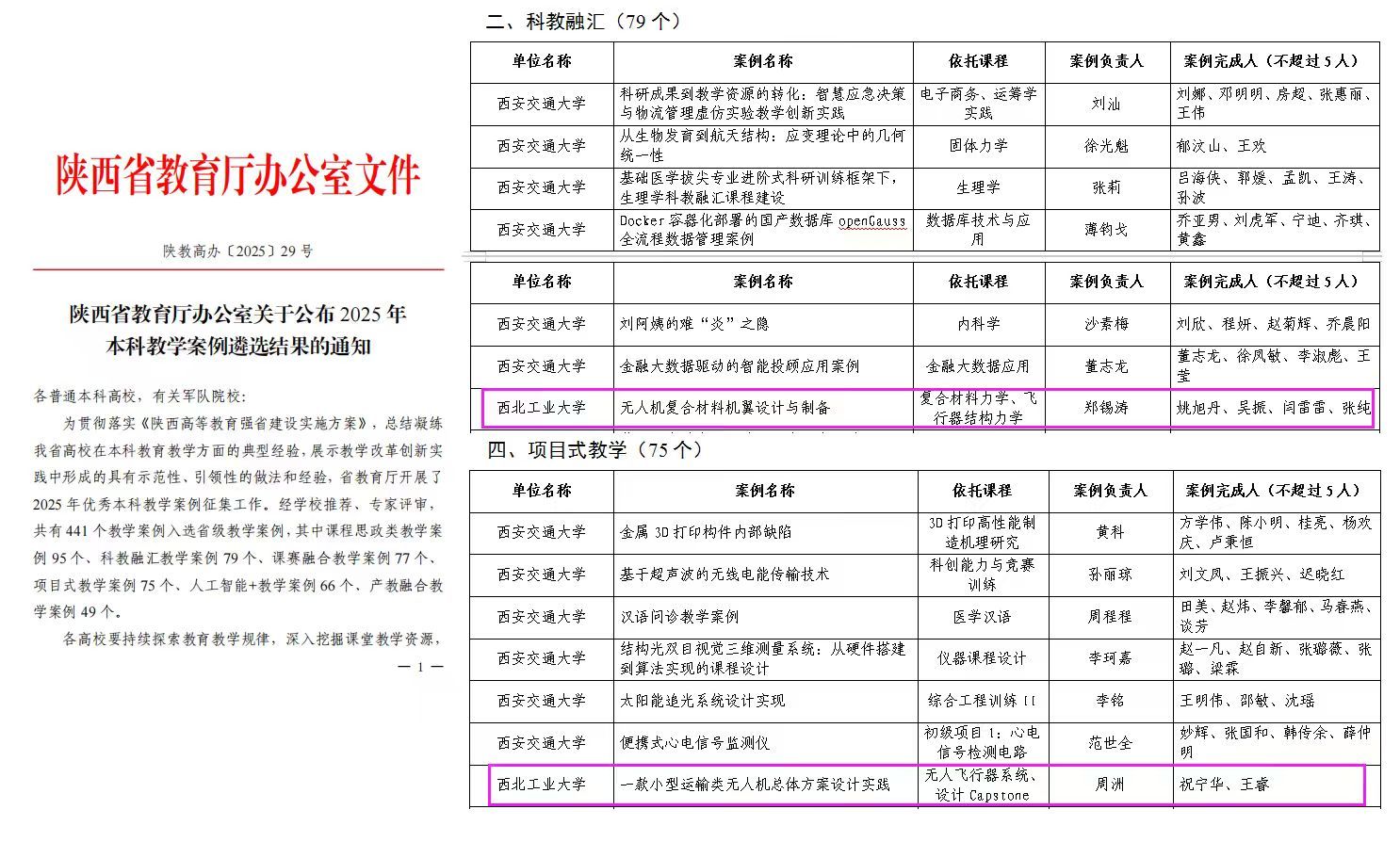 近日,陕西省教育厅正式公布了2025年陕西省本科教学案例遴选结果。伟德国际1949源于英国《无人机复合材料机翼设计制备》和《小型运输无人机总体设计实践》两项案例成功入选省级优秀案例,凸显我校“总师型”人才培育与思政教学深度融合的探索成果。案例以任务链驱动,通过一体化设计-制造-试飞全流程实战,推动学生从结构创新到系统把控的能力跃升,实现“工程师基底”向“总师视野”的跨界塑造。