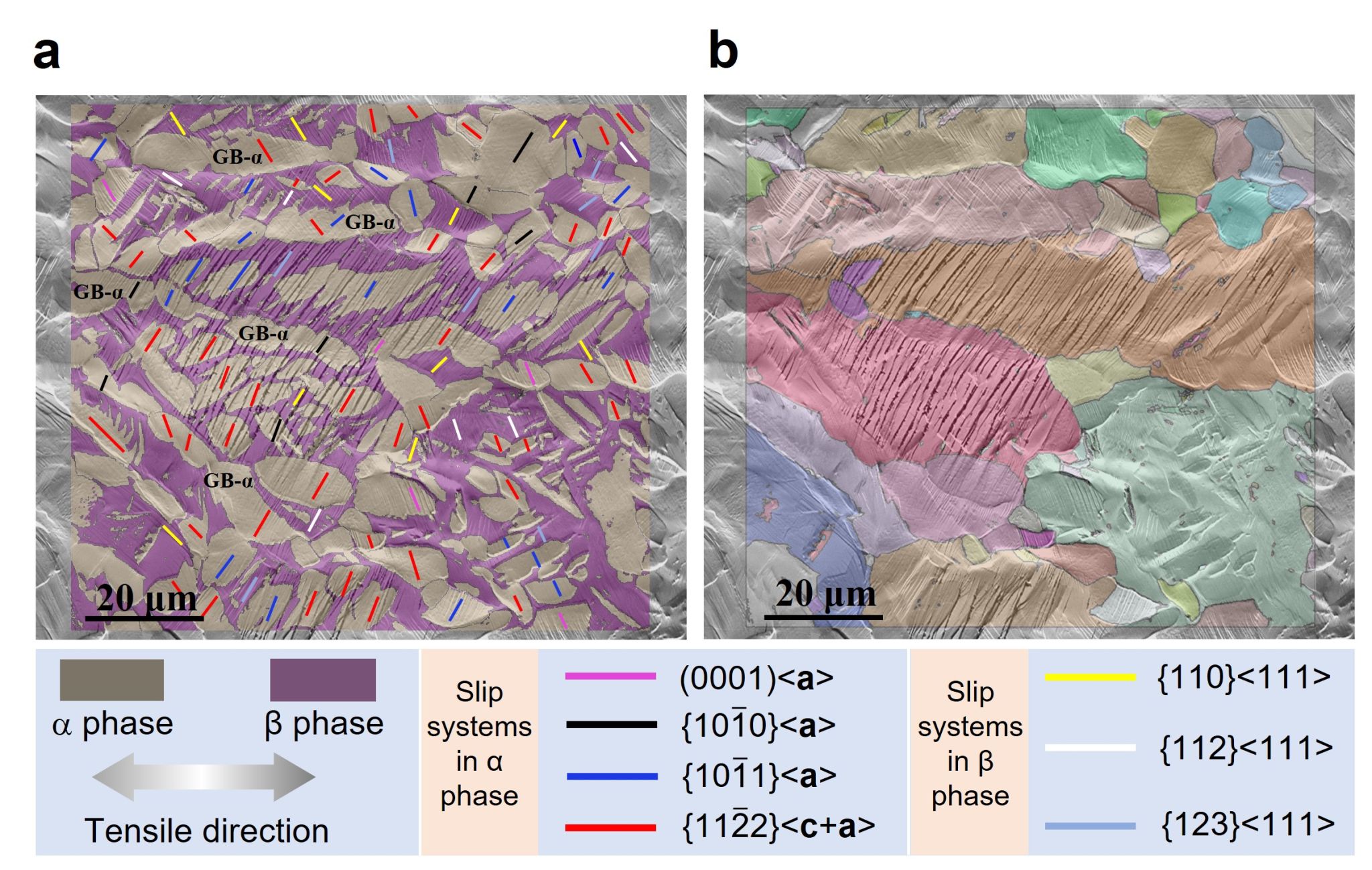图5. α-β Ti-0.45O-4Fe合金(PBF-LB + 800 °C退火1小时)在拉伸变形过程中的位错活动。
