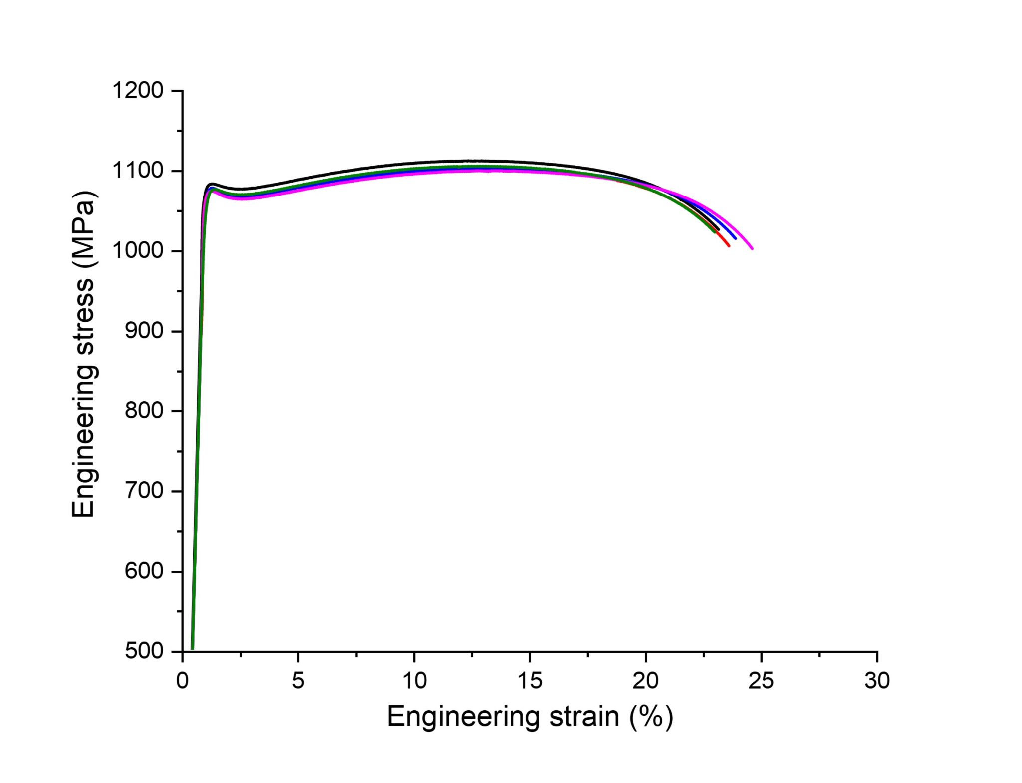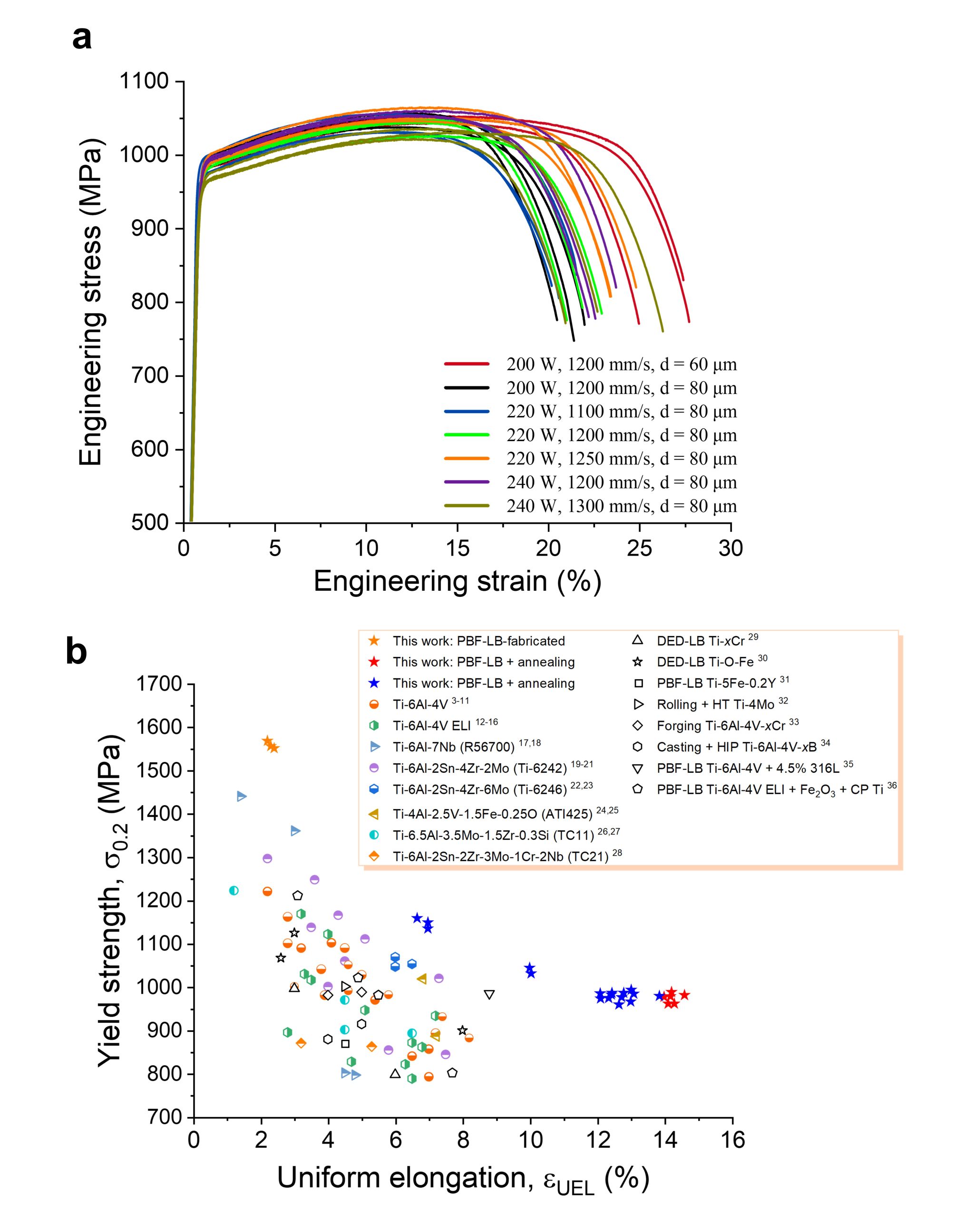 图7. Ti-0.5O-5Fe合金(PBF-LB + 800 °C退火1小时)的工程应力-应变曲线。