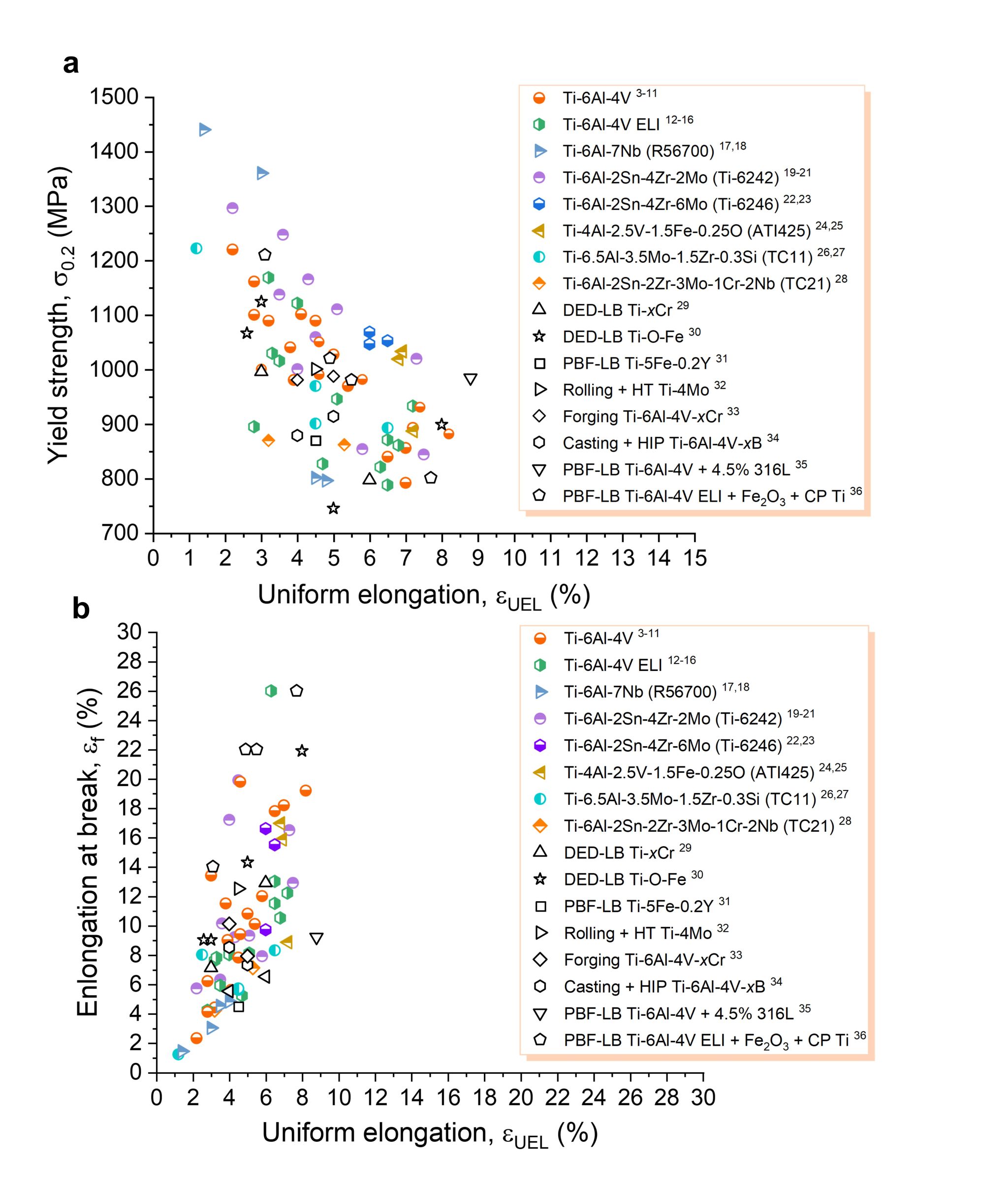 图1. 主要α-β钛合金的屈服强度、均匀延伸率和断裂延伸率对比。所有应变值均为工程应变。