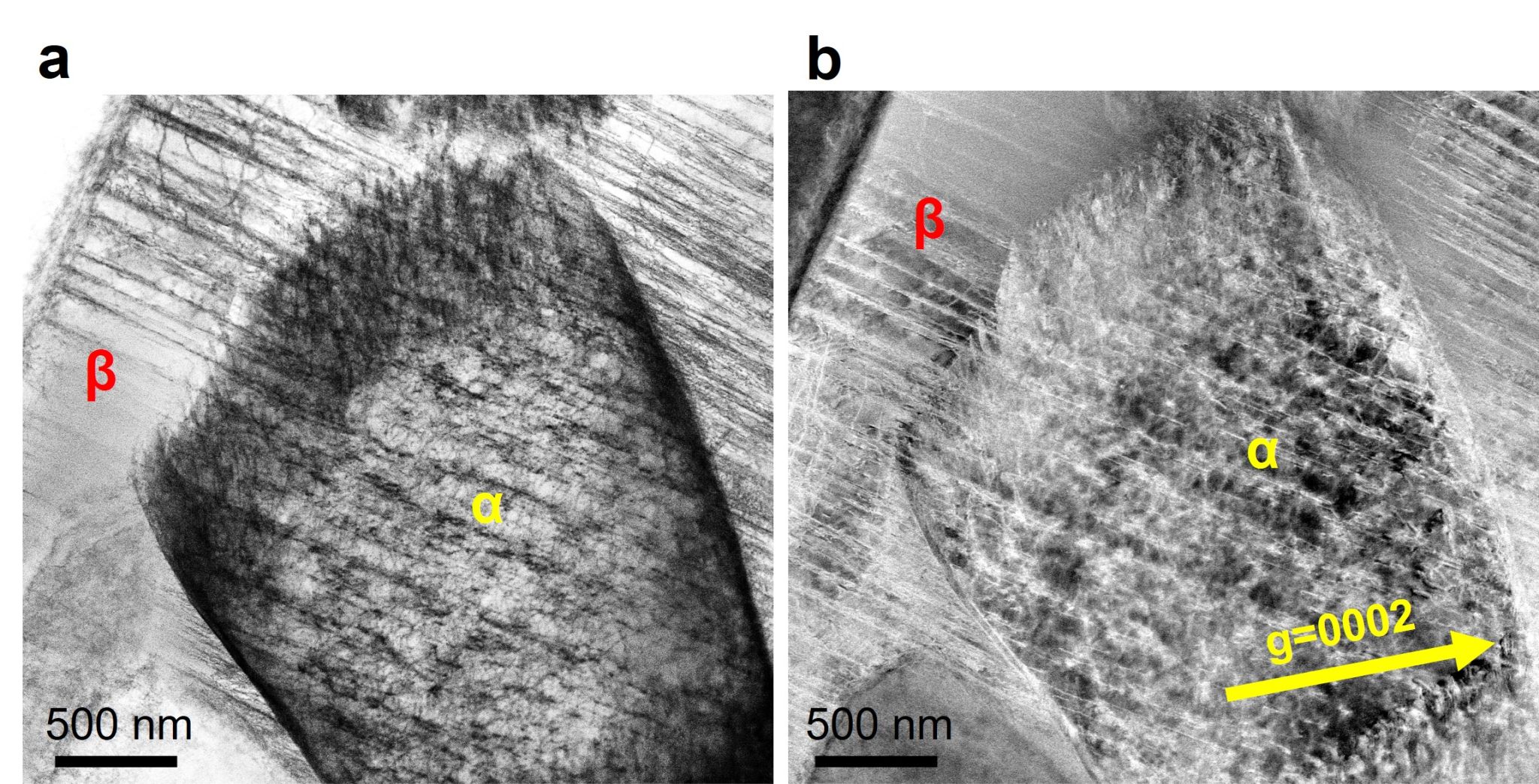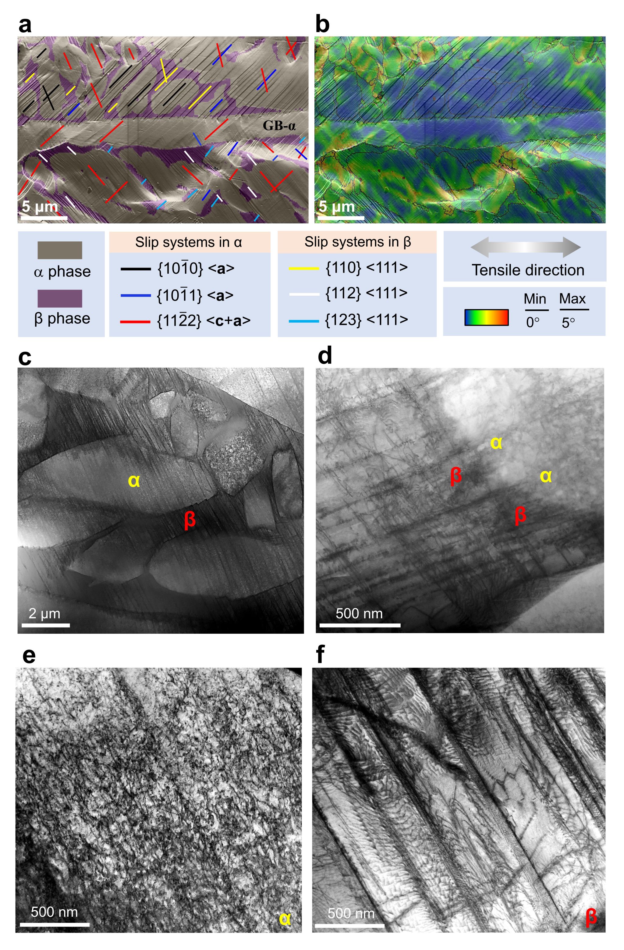 图8. α-β Ti-0.5O-5Fe合金(PBF-LB + 900°C退火1小时)在拉伸变形过程中的位错活动。