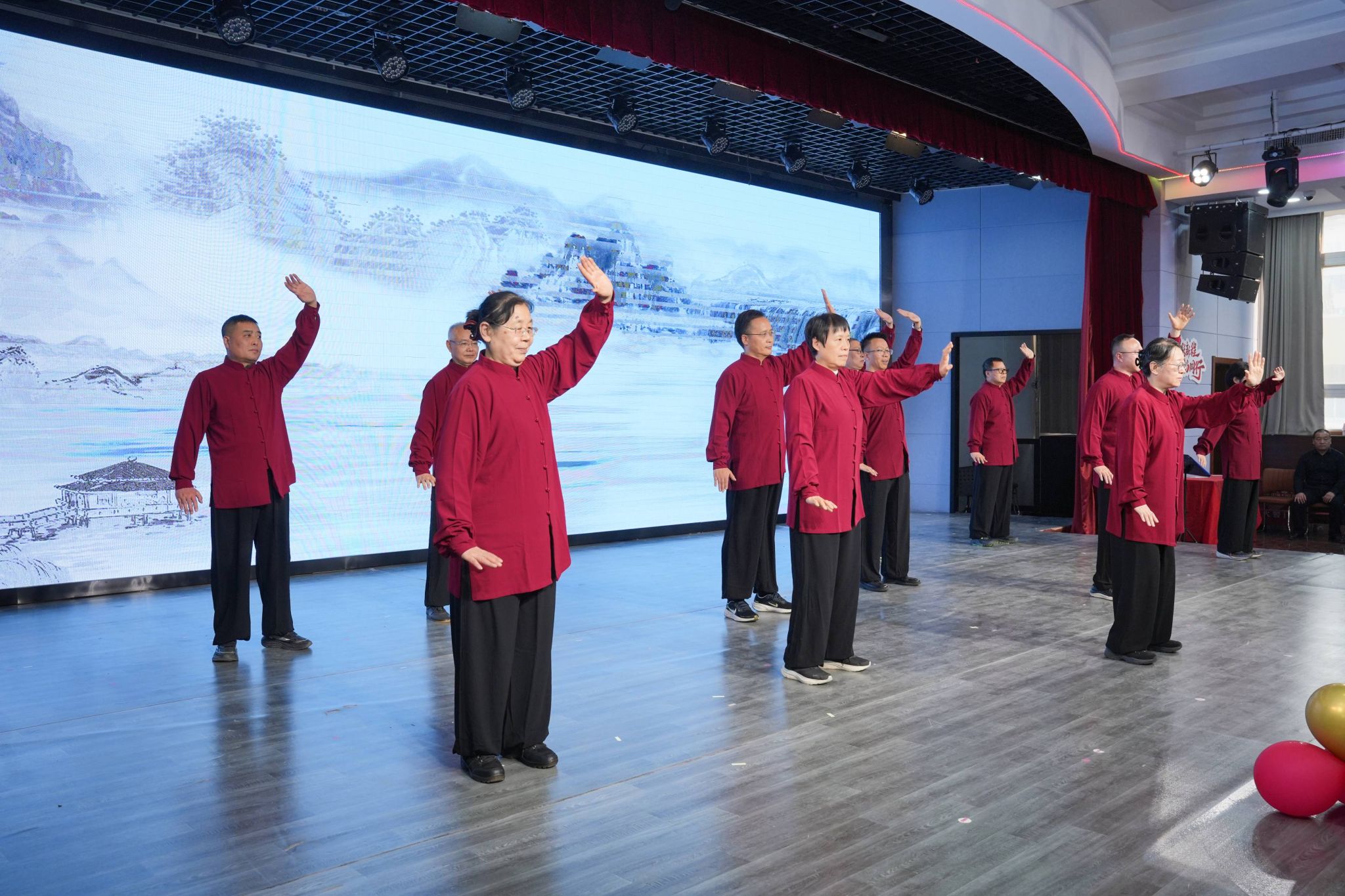 叶坤,惠增宏,叶正寅,武洁、宋文萍等教师表演的《八段锦》,动作舒缓整齐,展现了大家专注事业亦注重身心平衡、蓄力前行的态度。